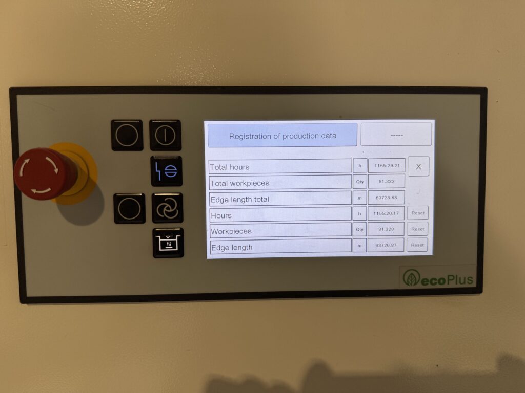 -Top and Bottom Fine Trimming Unit equipped with DFC cutter heads (indexed horizontally for more use of insert width), with combination radius / straight carbide inserts. Digital readouts provided. Three (3) working positions: flush trimming, trimming with overhang, and radius / bevel trimming. (R = 3 mm)