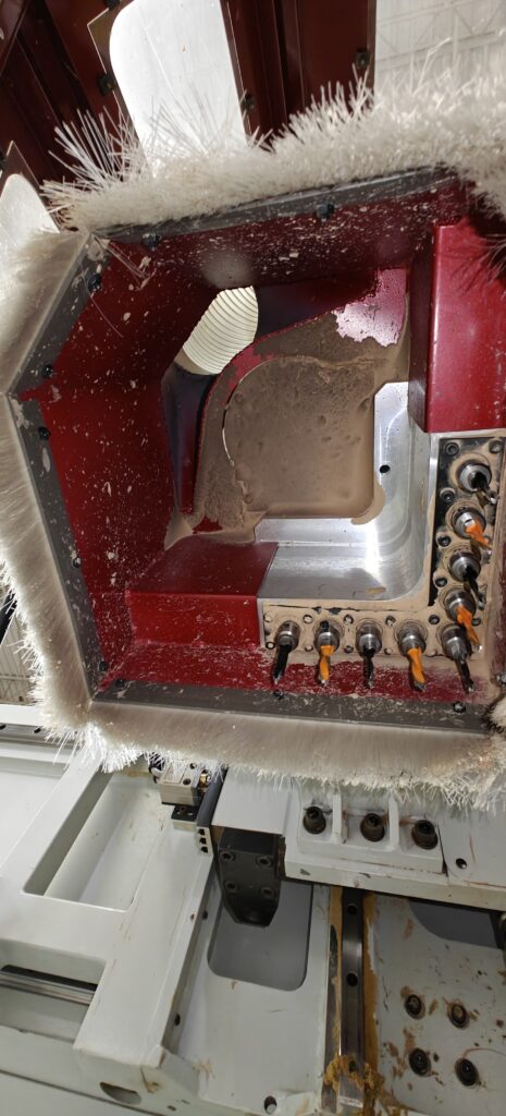 5′ x 12′ Grid table w/ double-zone phenolic vacuum plenum. (11) pop-up pins for part location within the table & (3) around the table perimeter for nested base manufacturing.
